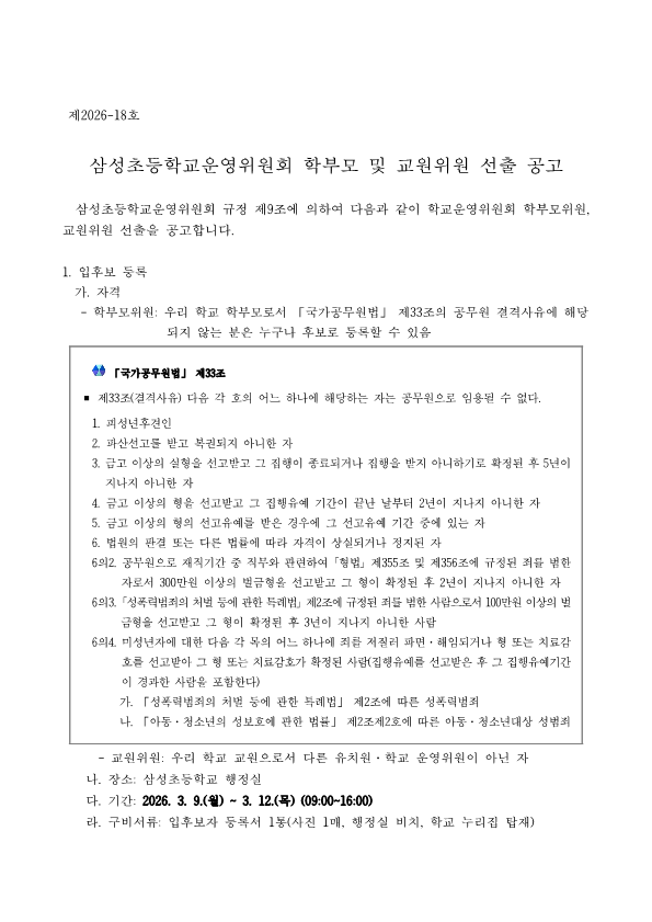 제16기 삼성초등학교운영위원회 학부모위원 및 교원위원 선출 공고