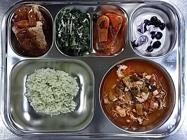 클로렐라밥 해물순두부국 (1.5.6.9.10.12.13.15.16.17)부추팽이나물 (5.6)생블루베리 요거트 (2.13)치즈돈카츠 (1.2.5.6.10.11.12.13.16.18)총각김치(자율) (9)우유 (2)