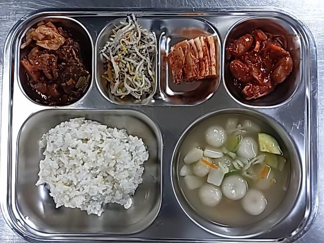 기장밥 감자옹심이국 (5.6.17.18)숙주나물 (5.6)소시지채소볶음 (2.5.6.10.12.13.15.16)순대주꾸미볶음 (2.5.6.10.13.16)배추김치(자율) (9)우유 (2)