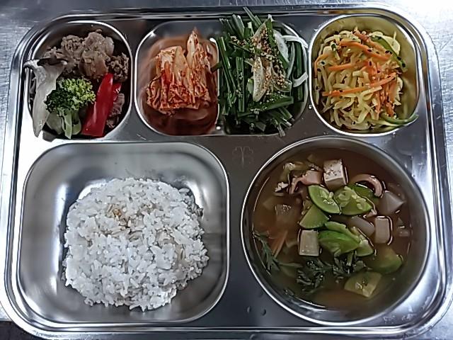 통밀밥 (6)오징어무국 (5.9.13.17)부추겉절이 (5.6.13)카레감자채볶음 (2.5.6.12.13.16.18)수제 맥적구이 (5.6.10.13)배추김치(자율) (9)우유 (2)