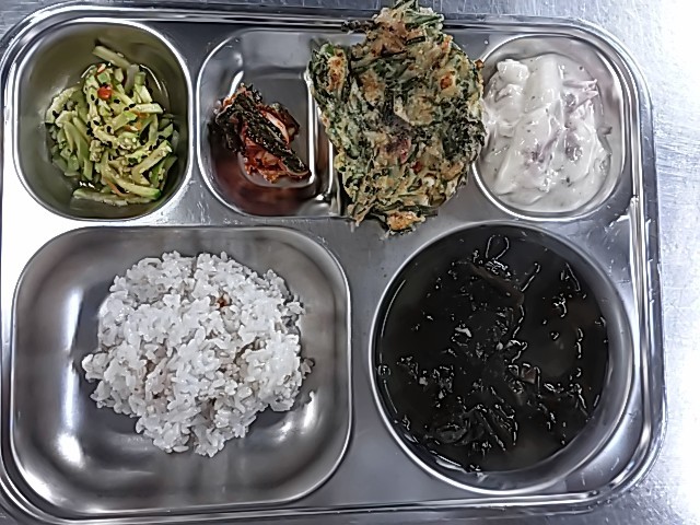 통밀밥 (6)대합미역국 (5.6.18)애호박새우젓볶음 (5.9)까르보나라 떡볶이 (1.2.5.6.10.12.13.15.16.18)부추전 (1.5.6.17)배추김치(자율) (9)우유 (2)