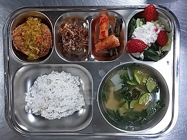 율무밥 모듬어묵국 (1.5.6.8.9.13.18)딸기어린잎채소샐러드 (2.13)멸치볶음 (5.6.13)치킨까스&카레소스 (1.2.5.6.10.12.13.15.16.18)총각김치(자율) (9)우유 (2)